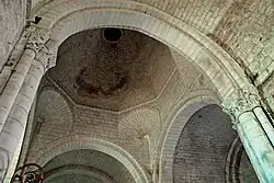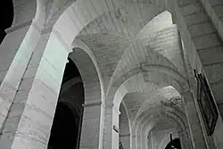 Das Mittelschiff des zugänglichen Teils des Langhauses ist mit einer Rundtonne überwölbt, die auf den Wänden und zusätzlich auf Gurtbögen ruht. Die Seitenschiffe sind mit Kreuzgratgewölben und runden Gurtbögen ausgestattet. Rundtonnen gibt es auch in den Querschiffarmen, im Chor und in den Kapellen, in den Raumabschnitten mit parallel verlaufenden Wänden. Die Chor- und Kapellenabsiden sind mit Kalotten überwölbt. In der Vierung leiten fächerförmig strukturierte Trompen vom Quadrat in ein Achteck über. Darauf sitzt eine achteckige Kuppel mit einem kreisförmigen Ausschnitt im Scheitel, zum Transport von Glocken. Alle Mauerwerkoberflächen, auch die der Gewölbe, sind steinsichtig und aus fast weißem Material exakter Fertigung, sauber vermauert und gefugt.