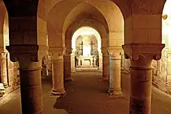 Dieser älteste Teil der Kirche stammt aus dem 11. Jahrhundert. Über eine mittig in der Vierung angeordnete Treppe gelangt man dorthin. Die Krypta hat nahezu den gleichen inneren Umriss der Außenwände, wie der darüber angeordnete Chor und ist durch vier gedrungene Rundstützen in drei Schiffe und fünf Joche aufgeteilt. Sie sind ausgestattet mit profilierten Basen und in Schulterhöhe mit einfach gestalteten Kapitellen und dicken Kämpfern. Darüber sitzt noch ein kurzes Stück Quadratpfeiler, von dem die Grate des Kreuzgratgewölbes aufgehen. Durch die senkrechten Schlitze der Fenster fällt wenig Tageslicht ein. Alles wirkt sehr massiv und frühromanisch.