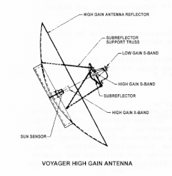 Praktisch die gesamte Kommunikation mit der Sonde wird über die auffällige Parabolantenne abgewickelt, die auf der zentralen Zelle montiert ist und aus einem Graphit-Epoxid gefertigt ist. Sie besitzt einen Durchmesser von 3,66 m und weist im X-Band einen Antennengewinn von 48 dBi auf, im S-Band 36 dBi. Da sie nur begrenzt beweglich ist, muss die Sonde genau auf die Erde ausgerichtet werden, um eine Verbindung aufbauen zu können. Zur Datenübertragung werden zwei Frequenzbänder eingesetzt: Das S-Band (2295 MHz) und das X-Band (8418 MHz). Für beide Bänder sind jeweils zwei Sender vorhanden, die nicht parallel betrieben werden können (sie dienen primär als Backup).[2] Zusammen haben sie eine Masse von 21,7 kg.