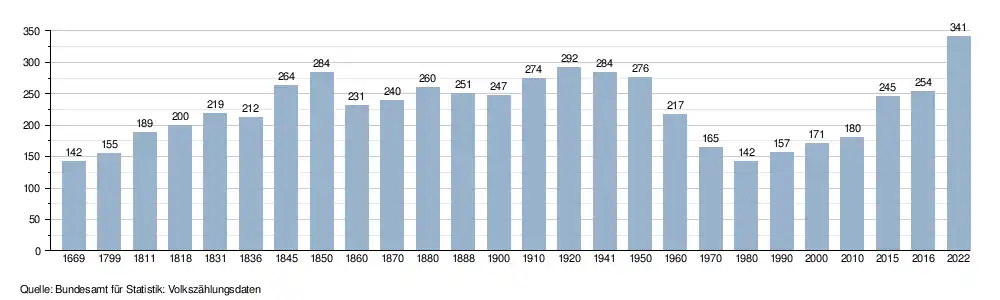 - ↑ Daten der Eidgenössischen Volkszählungen ab 1850 nach Gemeinden. (XLSX; 10 MB) Bundesamt für Statistik, Neuchâtel, 12. Juli 2024, abgerufen am 14. September 2025 (Öffnung in Excel nur über "Anhang/Excel-Datensatz" möglich).