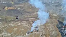 Am 10. Juli 2023 gegen 16:40 Ortszeit öffnete sich nordöstlich des Berges Litli-Hrútur eine ca. 200 m lange Spalte, aus der Lava austrat.[118] Die Stelle liegt 2 bis 3 Kilometer nordöstlich der Ausbruchsstellen von 2021 und 2022. Die Spalte weitete sich zuerst auf 1,5 km Länge aus, aber dann konzentrierte sich der Ausbruch auf ein Zentrum von 50 × 100 m. Die Seismografenstation „FAF“ (Fagradalsfjall) musste verlegt werden, da die Lava direkt auf sie zufloss.[119] Am 18. Juli 2023 hatte der Lavastrom der vorangegangenen vier Tagen nach Magnús Tumi Guðmundsson im Durchschnitt 13 m³/s Schüttung. Die 8,4 Millionen m³ Lava bedeckten nun 0,83 km² Fläche. Die Lava wanderte täglich 300–400 m in südwestliche Richtung vorwärts. Man befürchtete wieder, dass der Lavastrom die südliche Küstenstraße der Reykjaneshalbinsel erreicht. Die Täler, die als Auffangbecken hätten dienen können, sind durch die Ausbrüche von 2021 und 2022 schon gefüllt.[120] Þorvaldur Þórðarson ging davon aus, dass dieser Zeitpunkt ungefähr Mitte August sein kann. Der Ausbruch werde voraussichtlich ähnlich dem Ausbruch im Geldingadalur im Jahr 2021 ablaufen und wahrscheinlich ähnlich lange dauern. Es habe sich ein Gleichgewicht aus zufließender und abfließender Lava eingestellt, und wenn nichts Unerwartetes passiere, das den Vulkanschlot verstopft, dann könnte das ganze Wochen und Monate, möglicherweise sogar Jahre so weitergehen.[121]