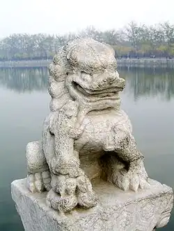 Zu Beginn der chinesischen Geschichte gab es keine Steinlöwen, da Löwen nicht in China vorkamen und daher unbekannt waren. Mit der Verbreitung des Buddhismus im 3. Jahrhundert von Indien nach China fehlten chinesischen Bildhauern reale Vorbilder für Löwen. Da sie eine gewisse Ähnlichkeit des Löwenkopfes mit dem des chinesischen Pekinesenhundes empfanden, übernahmen sie in ihren Skulpturen Elemente dieses Hundes und vermischten sie mit denen des Löwen. Der chinesische Begriff für Löwe shi (狮)[Anm. 1] ist vermutlich aus dem Persischen šer entlehnt worden, was wiederum darauf hinweist, dass der Löwe selbst nicht direkt aus Indien übernommen wurde.[1]