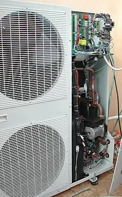 Eine Wärmepumpe ist allgemein eine Kraftwärmemaschine,[1] die unter Aufwendung technischer Arbeit thermische Energie aus einem Reservoir mit niedrigerer Temperatur (in der Regel ist das die Umgebung) aufnimmt und – zusammen mit der Antriebsenergie – als Nutzwärme auf ein zu beheizendes System mit höherer Temperatur überträgt.