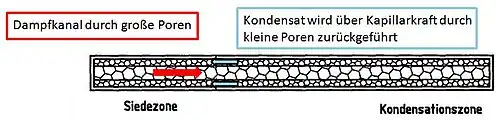 Durch externe Wärmezufuhr verdampft das Kondensat und bewegt sich als Gas durch o. g. Struktur ins Innere der Heatpipe, den Dampfkanal, über welchen es anschließend in den Kondensationsbereich gelangt. Dort, an einer Wärmesenke, bildet die Trennwand, wiederum als nichtbenetzbare poröse Struktur ausgebildet, die Übergangsstelle zum Kondensationsbereich. Durch Druck- oder Konzentrationsgefälle diffundiert das Gas nach außen und tritt mit den Außenwänden der Heatpipe in Berührung. An dieser Stelle wird Wärmeenergie abgegeben; der Dampf kondensiert. Hier besteht für das Kondensat aufgrund seiner großen Oberflächenspannung nur die Möglichkeit des Rückflusses durch den Kondensatkanal (Kapillarwirkung), an dessen Ende, am Ort der Wärmequelle, der Temperaturkreislauf durch äußere Wärmezufuhr wieder von Neuem beginnt.