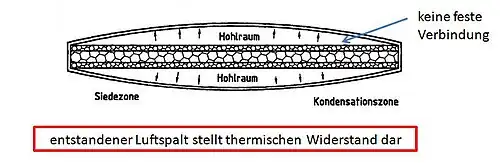 Neben der hierdurch resultierenden größeren Beschleunigungswirkung auf das Arbeitsmedium fällt dieser Technologie aber zu Laste, dass der Flüssigkeitstransport innerhalb der Heatpipe durch sehr kleine Strukturen, wie man es in der Praxis realisieren möchte, um einen größtmöglichen Erfolg zu verzeichnen, wiederum abgebremst, oder gar gänzlich unterbunden wird, weil die Poren zu klein zum Durchdringen geworden sind. Weiterer Störfaktor sind die unerwünschten Inhomogenitäten im Material (herstellungsbedingt), wie auch die sehr hohen Produktionskosten.[14]