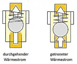 Zwei Heatpipes, je eine entspringend an der Wärmequelle und an der Wärmesenke, verlaufen an ihren Enden in geringem Abstand parallel zueinander, ohne sich dabei zu berühren. Umgeben sind sie in diesem Bereich von einem Körper (Koppler) aus gut wärmeleitendem Material (z. B. Kupfer oder Aluminium) mit zwei möglichst passgenau die Heatpipes führenden Bohrungen. Die Wärmeleitfähigkeit des Gesamtsystems lässt sich leicht durch Hineinschieben oder Herausziehen des Kopplers einstellen, da die Berührungsfläche zwischen Heatpipes und Koppler linear von der Einschubtiefe abhängt. Die Kopplung mit externer Steuerung durch einen kleinen Motor kann dabei an einen gut zugänglichen Ort verlegt werden, sofern der (sehr geringe) zusätzliche Wärmewiderstand der längeren Heatpipes diesen Umweg erlaubt.