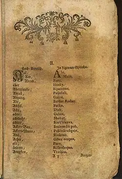 Das Wörterbuch von der Zigeunersprache 1755, nebst einem „Schreiben eines Zigeuners an seine Frau, darinnen er ihr von seinem elenden Zustande, in welchem er sich befindet, Nachricht ertheilet“, ist ein bedeutendes historisches Zeugnis zur Sprache und zur Sozialgeschichte der Sinti und Roma in Deutschland aus dem 18. Jahrhundert[1]. Es steht am Beginn der Verschriftlichung des Romani und ist das erste alphabetisch geordnete Wörterbuch dieser auf das Altindische zurückgehenden indoarischen Sprache. Von der allgemeinen Linguistik, Romistik, Sozialgeschichte und Minderheitenforschung sind Wörterbuch und Brief bis heute kaum wahrgenommen worden[2]. Als Bildungsgegenstand steht es im weitläufigeren Kontext der Wahrnehmung von Minderheiten, ihrer Sozialgeschichte und ihrer Sprache, hier der über Jahrhunderte hinweg diskriminierten und erst Ende der 1990er Jahre als nationale Minderheit anerkannten Sinti und Roma.