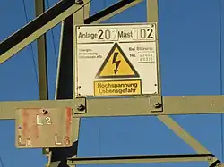 Im September 2025 noch angebrachtes Mastschild der EVS an einer Leitung beim Umspannwerk Pulverdingen