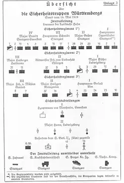 Die Demobilmachung des Heeres in den Friedensstandorten erfolgte überwiegend geordnet, manche lösten sich aber auch formlos auf. Die unübersichtliche Situation im Lande veranlasste das württembergische Staatsministerium Mitte Dezember, aus den vorhandenen Resten des alten Heeres 15 Sicherheitskompanien in Anlehnung an die bestehenden Heeresstandorte aufzustellen.