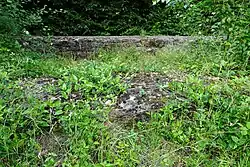 Die beiden an der Kirche freigelegten Grabplatten werden am Gut Harmuthshausen unter einem Schutzdach ausgestellt.