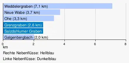 | Rechte Nebenflüsse | Butterbergbach, Galgenbergbach, Ohe, Mühlengraben, Neue Wabe, Alter Reitlingsgraben, Weddeler Graben | |