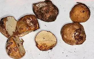 Die 0,7–5 cm hohen und 0,7–5 cm breiten Fruchtkörper sind trüffelartig bis kugelig geformt und haben eine weiche bis feste mitunter auch harte Konsistenz. Die Gleba hat eine wabenartige Struktur und ist weißlich oder gelblich bis ockergelb gefärbt. Sie scheidet bei Verletzung einen milchigen Saft aus. Die äußere Oberfläche ist glatt und weißlich bis gelblich oder blassocker bis braun gefärbt. Bei Berührung verfärbt sich der Fruchtkörper manchmal gelblich. Der Geruch ist stark hefe- oder knoblauchartig.[1][2]