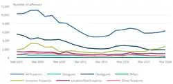 Von 2006 auf 2007 fiel die Zahl der Straftaten mit Schusswaffen um 13 % auf 9.608 Fälle. Mehr als die Hälfte dieser Straftaten trugen sich im Bereich der Metropolitan Police in London, Greater Manchester und den West Midlands zu. Im Bereich der Stadt London stieg die Anzahl der Fälle sogar von 3.485 auf 3.607 Fälle (+3,5 %). Bei der Bandenkriminalität wurde in den vergangenen Jahren beobachtet, dass eine Reihe von Schusswaffen-Nachahmungen eingesetzt wurden. Ein Teil dieser Waffen ließ sich mit entsprechenden Mitteln zum Verschießen „scharfer“ Munition umrüsten. Nach Meinung der BBC ist Schusswaffenkriminalität in Großbritannien kein generelles Problem, sondern auf einige wenige Städte beschränkt.[28][29]