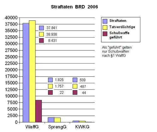 Waffenbesitz und Waffenhandel werden in Deutschland durch das Waffengesetz (WaffG), das Sprengstoffgesetz (SprengG) und das Kriegswaffenkontrollgesetz (KWKG) reglementiert. Sie sollen mithelfen, dem Waffenmissbrauch vorzubeugen. 2006 wurden 40.175 Straftaten im Zusammenhang mit dem Waffen-, Sprengstoff- und Kriegswaffenkontrollgesetz gezählt. Dieses entspricht 0,6 % aller Straftaten in Deutschland. Davon entfielen 37.841 Straftaten auf das Waffengesetz, 509 auf das Kriegswaffenkontrollgesetz und 1.825 auf das Sprengstoffgesetz. Straftaten im Zusammenhang mit diesen Gesetzen betreffen zu ca. 80 % die Herstellung, den Handel sowie den Besitz von Waffen und Explosivstoffen. In ca. 20 % der Fälle werden Schusswaffen (inkl. Schreckschusspistolen, Replika) ohne behördliche Erlaubnis mitgeführt, z. B. auf Volksfesten. Die genannten Straftaten beinhalten nicht die Bedrohung oder das Schießen mit Schusswaffen.