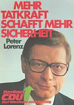 Die Wahl zum Abgeordnetenhaus von Berlin am 2. März 1975 stand ganz im Zeichen der Entführung des CDU-Spitzenkandidaten Peter Lorenz, der zum zweiten Mal nach 1971 antrat. Lorenz war drei Tage vor der Wahl von Terroristen der Bewegung 2. Juni entführt worden, die die Freilassung von sechs verurteilten Straftätern der Rote Armee Fraktion (RAF) und der Bewegung 2. Juni verlangten. Für die SPD trat zum zweiten Mal der Regierende Bürgermeister Klaus Schütz an, der in der misslichen Lage war, über das Leben seines Herausforderers bestimmen zu müssen. Nachdem die Bundesregierung den Forderungen nachgab und fünf Gefangene in Begleitung des ehemaligen Berliner Bürgermeisters Heinrich Albertz in den Südjemen ausgeflogen wurden, kam Lorenz zwei Tage nach der Wahl frei.[3] Die Atmosphäre vor der Wahl war durch ein starkes Gefühl der Verunsicherung und eine politische Polarisierung angesichts der Terror- und Gewaltakte der RAF und ihrer Sympathisanten geprägt. Schon die Ermordung des Berliner Kammergerichtspräsidenten, Günter von Drenkmann, im Herbst 1974 hatte die öffentliche Meinung erschüttert. Hinzu kamen scheinbare Unwägbarkeiten, die mit der Deutschlandpolitik der sozialliberalen Koalition einhergingen, und von denen Berlin als „Frontstadt“ des Westens besonders betroffen war.[4]