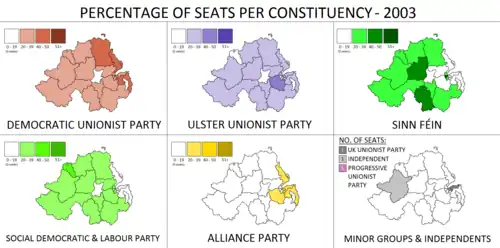 Unionistische Parteien gewannen 59 der 108 Sitze, irisch-republikanische Parteien (Sinn Féin und SDLP) gewannen 42, in dieser Frage weitgehend neutrale Parteien (Alliance, Dr. Deeny) gewannen 7. Kurz nach der Wahl wechselten drei unter Parteibanner der UUP gewählte Abgeordnete (Jeffrey Donaldson, Arlene Foster und Norah Beare) ins Lager der DUP; ein DUP-Abgeordneter schied aus der Partei aus und agierte künftig als Unabhängiger.[2][8] Da sich die DUP weigerte, Sinn Féin ohne weitere Garantien eine Teilhabe an der politischen Machtausübung zuzugestehen, blieb die Nordirland-Versammlung auch nach der Wahl 2003 suspendiert. In diesem Zustand verblieb sie über die ganze Legislaturperiode bis zum 7. Mai 2007, an dem Neuwahlen erfolgten. Ab Januar 2004 fanden erneute Gespräche zwischen den Parteien über die Ausgestaltung des Karfreitagsabkommens statt.[2]