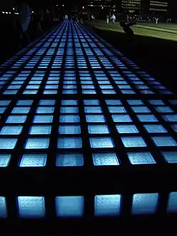 An der von Linden eingerahmten Promenade erstreckt sich der vom Künstler Christopher T. Hunziker entwickelte 160 Meter lange und drei Meter breite Sitzbalken aus 7'000 blauen Glasbausteinen. Durch fluoreszierende Lichtröhren im Inneren leuchtet der Balken in der Nacht. Die Entstehung des Sitzbalkens, bzw. des sich darunter befindenden Kellerraums ist der Altlastensanierung geschuldet, für die vor Baubeginn des Wahlenparks der belastete Boden ausgehoben und entsorgt werden musste.[4]