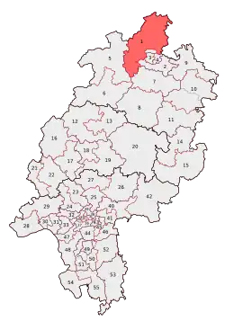 | 2023 | Wahlkreis 1 – Kassel-Land I[21][22] | Bad Emstal, Bad Karlshafen, Breuna, Calden, Espenau, Fuldatal, Grebenstein, Habichtswald, Hofgeismar, Immenhausen, Liebenau, Naumburg, Oberweser, Reinhardshagen, Trendelburg, Wahlsburg, Wolfhagen, Zierenberg sowie den Gutsbezirk Reinhardswald | Hans Christian Göttlicher | CDU | 30,8 |