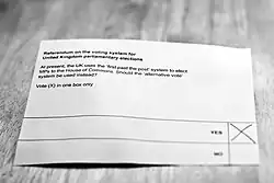 Diese Wortwahl wurde durch die Electoral Commission (Wahlkommission) kritisiert, da die Frage möglicherweise insbesondere für Personen mit geringer Bildung und Leseschwierigkeiten nicht verständlich genug formuliert sei.[19] Daraufhin wurde die Formulierung entsprechend den Vorschlägen der Electoral Commission geändert.[20] Am 7. September 2010 wurde die Gesetzesvorlage vom Unterhaus in erster Lesung mit einer Mehrheit von 328 zu 269 Stimmen angenommen.[21] Eine durch das Oberhausmitglied Lord Rooker im Oberhaus eingebrachte Gesetzesnovelle sah vor, dass das Referendum nur dann Gültigkeit haben solle, wenn die Wahlbeteiligung mehr als 40 % betrüge: