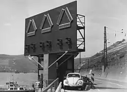 Signalstelle C Am Betteck für die Bergfahrt. Angezeigt wird: mindestens ein Talfahrer bis 110 m in Abschnitt 5 (gemeint ist das Schiff links im Bild), keine Talfahrt in den Abschnitten 4 und 3. |