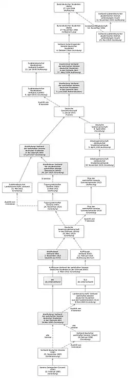Im ideologischen Umfeld Georg von Schönerers gründete sich 1885 der Vereins-Delegierten-Convent als Zusammenschluss von Wiener Studentenvereinen.[A 1] In den Folgejahren traten weitere Vereine bei, spalteten sich in einen eigenen Verband ab und schlossen sich schließlich am 24. Mai 1890 in Waidhofen an der Ybbs im Waidhofener Verband der wehrhaften Vereine deutscher Studenten in der Ostmark zusammen.[2] Im März 1896 führte der WV das Waidhofener Prinzip ein, an dessen Formulierung verschiedene Mitgliedsvereine des WV maßgeblich beteiligt waren. Als Reaktion wurde im Mai 1896 der Verband durch die staatlichen Behörden aufgelöst.[3] Im Jahr 1912 wurde der WV mit dem Landsmannschaftlichen Verband wehrhafter Vereine deutscher Studenten aus den Sudetenländern zusammengeführt, trennte sich 1913 wieder, um sich 1919 erneut zusammenzuschließen, diesmal unter dem Namen Deutsche Vereinsstudentenschaft in der Ostmark.