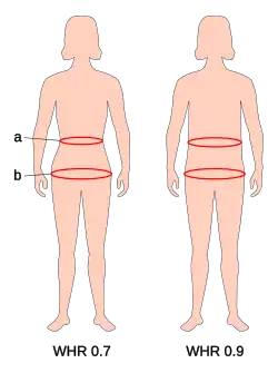 Die Weltgesundheitsorganisation (WHO) definiert abdominale Adipositas als ein Taille-Hüft-Verhältnis von über 0,90 bei Männern und über 0,85 bei Frauen.[5]