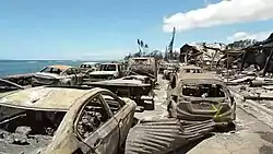 Die Brände führten zum Tod von 100 Menschen (Stand 14. November 2023) in der Stadt Lāhainā, es wurden zu dem Zeitpunkt noch 4 Menschen vermisst.[12] In der Stadt lebten vor der Katastrophe fast 13.000 Menschen. Mehr als 2000 Gebäude wurden zerstört oder brannten teilweise ab, darunter mehrere historische Bauwerke.[13] Zu den zerstörten Gebäuden gehörten die Waiola Church und das Pioneer Inn.[6][14] Es wird davon ausgegangen, dass die Schäden bei ca. 5,5 Milliarden Dollar liegen werden.[15][16]