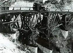 Die schmalspurige Waldbahn wurde ursprünglich für den Materialtransport beim Bau der Bleichert-Seilbahn verlegt und wurde erst später für den Holztransport genutzt.[15][6][16][17][18][2][19][20][21]