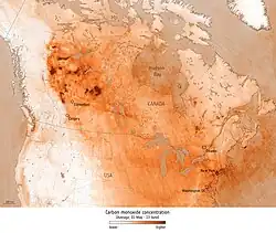 Bis Oktober emittierten die Brände mehr als 1,5 Mrd. Tonnen Kohlenstoffdioxid, mehr als die 22 vorangegangenen kanadischen Waldbrandsaisons zusammen.[7] Insgesamt wurden 647 Mio. Tonnen Kohlenstoff freigesetzt, was um ein Vielfaches höher liegt als die Emissionen im vorangegangenen Jahrzehnt (ca. 29 bis 121 Mio. Tonnen Kohlenstoff) und mehr ist als der jährliche Ausstoß von Staaten wie Deutschland, Japan oder Russland. Nur China, Indien und die USA stießen noch mehr Kohlenstoff aus.[50] Diese Treibhausgasemissionen verstärken wiederum den Klimawandel.[51] Alleine bis Mitte September emittierten die Brände rund 410 Mio. Tonnen reinen Kohlenstoff, fast dreimal so viel wie in der bisherigen Rekordsaison 2014, als 138 Mio. Tonnen Kohlenstoff freigesetzt wurden.[52]
