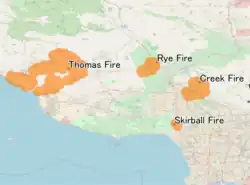 Das Feuer war am 4. Dezember 2017 in Santa Paula ausgebrochen. Es bewegte sich rasch auf Ventura zu und zerstörte noch in derselben Nacht mehr als 500 Wohnhäuser.[5] Es fraß sich durch die Santa Ynez Mountains, dehnte sich auf den Los Padres National Forest aus und erreichte Santa Barbara County. Am 14. Dezember starb ein Feuerwehrmann bei den Löscharbeiten in der Nähe von Fillmore.[6]