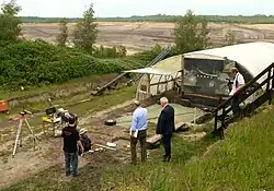Bedeutende Funde kamen auch im Geiseltal, ebenfalls Sachsen-Anhalt, zu Tage. Dort fanden sich am Ufer eines ehemaligen Sees, dem Seebecken Neumark-Nord 1, Skelette von rund 70 Individuen des Europäischen Waldelefanten, einige davon weitgehend vollständig; sie verteilten sich rund um den See. Die Altersstellung des Seebeckens wird diskutiert und schwankt, je nach Ansicht, von der vorletzten Warmzeit vor rund 200.000 Jahren bis zur letzten Warmzeit. Die zahlreichen Skelettfunde und guten Erhaltungsbedingungen ermöglichten dabei die Überlieferung selten nachgewiesener Knochen wie dem Zungen- und dem Brustbein.[21] Einzelne Tiere wiesen pathologische Veränderungen auf, etwa in Form einer Hüftgelenksdysplasie, verkümmerter Stoßzähne oder Durchbohrungen, die eventuell auf Rivalenkämpfe zurückgehen könnten.[22][23][24] Die Tiere starben eines natürlichen Todes, wurden im Nachhinein aber von großen Raubtieren wie dem ebenfalls belegten Höhlenlöwen oder der Höhlenhyäne zerfleddert.[25] Einzelne Skelette waren mit großen Feuersteinabschlägen verbunden, die auf Aktivitäten des frühen Menschen hindeuten. Eines dieser als „Tranchiermesser“ bezeichneten Artefakte wies noch einen organischen Rest auf, der sich als Eichenrindenextrakt herausstellte.[26][20][27][28]