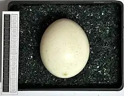 Im südlichen Verbreitungsgebiet beginnen Waldkäuze ab Februar zu brüten. In Mitteleuropa brüten sie gewöhnlich ab März. Im Stadtbereich brütende Waldkäuze beginnen ihr Brutgeschäft aber bis zu einem Monat früher;[24][43] auch vereinzelte „Winterbruten“ zwischen November und Januar, also direkt im Anschluss an die Herbstbalz, sind belegt.[46] Das Gelege besteht in der Regel aus zwei bis vier Eiern. Gelege können aber auch nur ein Ei oder bis zu sieben Eier aufweisen. Die Eier sind elliptisch bis spindelförmig und messen im Durchschnitt 46,7 mal 39,1 Millimeter.[43] Ihre Schale ist glatt und glänzt leicht. Gelegentlich weist die Schale kleine Knötchen oder Längsrillen auf. Die Eiablage erfolgt meist nachts. Der Legeabstand beträgt zwischen zwei und vier Tagen.[43] Waldkäuze ziehen nur eine Jahresbrut groß. Bei Gelegeverlust kommt es aber zu Nachgelegen.[47]