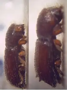 Waldrebenborkenkäfer (Xylocleptes bispinus), Weibchen (links) und Männchen (rechts) | ||||||||||||