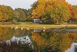 | Ansicht Waldsee vom Westufer mit Badeinsel, Oktober 2008 | ||