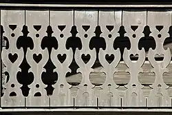 Der Böhmerwald lieferte das Baumaterial für die Blockbohlenhäuser. Die Balken wurden früher mit einem breiten Zimmermannsbeil behauen und zu späteren Zeiten gesägt. Die Eckverbindungen der Hauswände waren überwiegend gezinkt und selten verschränkt. Die Innenwände wurden in die Außenwände eingezapft und meist verputzt.[3] Die weitausladenden Satteldächer mit geringer Neigung waren früher „Legbretterdächer“, bei denen die Dachdeckung mit Steinen beschwert wurde. Später wurde auch mit Holzschindeln eingedeckt, die heute fast alle durch Ziegel-, Schiefer- oder Blecheindeckungen ersetzt sind. Die West- und Straßenfassaden waren ebenfalls mit Schindeln als Wetterschutz bzw. zur Zierde verkleidet. Die Schindeln erhielten dann runde, geschwungene oder spitze Schmuckformen.[3] Der Balkon im Dachgeschoss führte über die gesamte Breite des Hauses. Er wurde mit geschnitzten Balkonbrettern verkleidet.