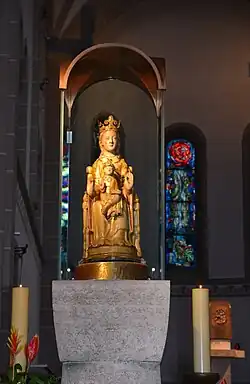 - Über dem Zelebrationsaltar hing bis zur letzten Renovierung 2009/10 ein Triumphkreuz, eine Arbeit von Josef Baron, bestehend aus polierter Bronze und ist etwa vier Zentner schwer. Das Kreuz ist mit Bergkristallen in unterschiedlichen Größen geschmückt, ein roter Jaspis symbolisiert die fünf Wunden Jesu. Das Zentrum des Kreuzes zeigt den gekreuzigten Christus mit einer Königskrone.[20] An dessen Stelle hängt nun ein monumentales Holzkreuz mit farblich gefasstem Christus-Holzkorpus.
