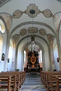Den Innenraum prägen Sgraffito-Malereien mit Régence-Motiven. Die drei spätbarocken Altäre sind konzentrisch angeordnet. Der Hochaltar zeigt das Gnadenbild der Muttergottes, welche von einem Strahlenkranz und einer doppelten Wolkenglorie umrahmt ist. Beim Gnadenbild handelt es sich um eine spätgotische Madonna, welche um das Jahr 1530 aus Lindenholz geschnitzt wurde. Ihre Fassung stammt aus der Barockzeit und imitiert Brokatstoffe. Über dem Gnadenbild sind das Auge Gottes und darüber das vom Schwert durchbohrte Herz Mariens angebracht. Der Tabernakel des Hochaltars stammt aus der Rokokozeit. Die beiden Seitenaltäre sind in ihrer Form an den Hochaltar angepasst. Die Altarblätter wurden um 1845 von Johann Füglistaller im Nazarenerstil erneuert. Der rechte Seitenaltar zeigt die Heilige Familie, der linke Seitenaltar stellt die Eltern der Gottesmutter dar, Joachim und Anna. Gezeigt wird die Szene, in der Anna ihre Tochter Maria unterweist. Über dem Chorbogen steht in einer Nische eine barocke Figur des Jesusknaben. Der Volksaltar stammt aus dem Jahr 1983.[3]