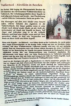 Nachdem der Bildstock im Laufe der Jahrzehnte zunehmend verwittert war, ließ die Pfarrgemeinde St. Sebastian Reschen um 1885/1886 die heutige Kapelle etwas abseits der Unfallstelle errichten, da sie am ursprünglichen Platz wegen Erdrutschgefahr nicht sicher war. Sie wurde der Mutter Gottes, auch bezeichnet als Unsere Liebe Frau, geweiht und „Unsere Liebe Frau im Valliertegg“ genannt. Darüber hinaus wurde wenige Jahre später ein Kreuzweg vom Ortszentrum zur Kapelle mit einem Höhenunterschied von fast 250 Metern angelegt. Seitdem gehen alljährlich regelmäßige Bitt- und Dankprozessionen entlang des Kreuzweges zur Kapelle. Der Innenraum ist mit Votivbildern als Dankesgabe geschmückt. Besonders beliebt sind die jährlichen Pilgerwanderungen an Silvester, bei denen das Neue Jahr mit Gebet und Gesang in der Stille des Waldes begrüßt wird.