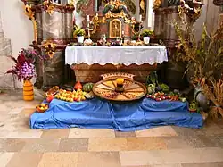 Für das Erntedankfest wird der Altar mit Früchten, Saaten und Gemüse aus Baitenhausen geschmückt.