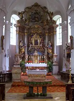 Das Gnadenbild, Ursprung der Wallfahrt zum Heilbrünnl, stammt aus dem 17. Jahrhundert. Es handelt sich um eine Nachbildung des Gnadenbilds der Alten Kapelle in Regensburg, beide gehen letztendlich zurück auf das Lukasbild Salus populi Romani in Santa Maria Maggiore in Rom. Maria hält das Jesuskind auf dem rechten Arm, beide tragen eine reich geschmückte Krone. Das Kind hält einen Apfel in seiner Rechten. Das Bild ist in einen prächtigen Rahmen gefasst und wird von zwei Engelsfiguren gehalten; vor einem geöffneten Vorhang schwebt links und rechts je ein Putto über den Engelsfiguren. Figuren der Eltern Mariens, Joachim und Anna stehen links und rechts zwischen jeweils zwei Säulen. Im Altarauszug ist ein rundes Gemälde von Gott dem Vater zu sehen; er sitzt auf der Weltkugel, ein Kranz von Wolken umgibt das Bild. Daneben ist die Taube als Symbol für den Heiligen Geist zu sehen. Vier weitere Engelsfiguren stehen dabei.