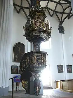 Die Kanzel wurde 1703 aus der Stiftskirche Seitenstetten hierher übertragen und zeigt einen bemerkenswerten reichen frühbarocken Typus mit Statuettennischen zwischen Hermenvoluten und maskenbeschlagen Ecksäulchen zwischen zahlreichen Engeln bezeichnet mit H(ans) S(eiz) 1636.
