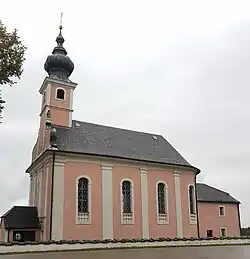 Das Bauwerk ist ein dreijochiger Saalbau mit halbrundem Abschluss, der durch Pilaster mit Blendbalustraden gegliedert ist. Der Chor ist außen und innen ohne erkennbare Trennung vom Langhaus. Westlich ist ein Vorzeichen angebaut, darüber befindet sich am Ansatz zum schwach ausgebildeten Schweifgiebel ein Schutzmantelmadonna-Außenfresko, das der Kirchenmaler Georg Gschwendtner 1947 angefertigt hatte. Der auf dem Westgiebel sitzende Dachreiter besitzt eine Laternenhaube, am Chorschluss ist die zweigeschossige Sakristei angebaut. Das Langhaus und der Chor sind im Innern mit einem flachen Stichkappengewölbe versehen, im westlichen Joch ist die mit zahlreichen Malereien geschmückte geschwungene Doppelempore eingebaut.