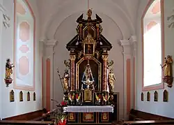 Der Hochaltar um 1660/1670 als Säulenädikula mit gesprengtem Dreieckgiebel und Auszug, er zeigt das mittige Gnadenbild Maria-Hilf von Johann Philipp Ruckerbauer 1714, darüber befindet sich ein weiteres Gnadenbild Maria-Hilf aus 1676 in einem bemerkenswerten Rokokorahmen, welches aus der Wasserkapelle hierher übertragen wurde, der Auszug zeigt einen Gnadenstuhl, der Altar trägt die Figuren der Heiligen Anna und Johannes der Täufer und Michael als Bekrönung. Der Tabernakel aus dem Ende des 19. Jahrhunderts trägt barocke Engelköpfe als Kerzenhalter und die bekrönende Figur Maria Immaculata aus dem zweiten Viertel des 18. Jahrhunderts.