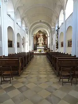 Die Wallfahrtskirche ist dem Bautyp nach eine dreischiffige Basilika. Das Mittelschiff mit Satteldach ist gegenüber den Seitenschiffen mit flach gedeckten deutlich überhöht und schließt in einem etwas niedrigeren Chor mit einer halbrunden Apsis. An die beiden Seitenschiffe schließt nach vorne jeweils ein Turm mit Spitzhelm an. Das Langhaus ist siebenjochig, sowohl Mittel- als auch Seitenschiffe sind mit Kreuzgratgewölbe ausgestattet, dessen Gurtbögen aus Pilastern aufsteigen. Die Durchbrüche vom Mittelschiff zu den Seitenschiffen sind rundbogig ausgeführt; darüber befinden sich jeweils Emporen mit Obergaden. Im vordersten Joch befinden sich in den Seitenschiffen Nebenräume, darüber jeweils ein Oratorium, das von der jeweiligen Empore aus zugänglich ist. Die seitlichen Wände der Seitenschiffe besitzen Rundbogennischen, anstelle eines Fensters befindet sich in der dritten Nische von hinten jeweils ein Nebenaltar.[4]