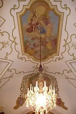 Der Kirchenraum besteht aus einem hohen einschiffigen, dreijochigen Langhaus mit barockem Tonnengewölbe. An der Decke befindet sich ein 1744 gemaltes barockes Deckenfresko, das Marias Himmelfahrt darstellt. Der Fronbogen trennt das Langhaus vom Presbyterium. Wandfresken zeigen Maria Verkündigung.