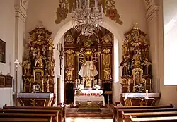 Im an drei Seiten mit Fenstern ausgestatteten Presbyterium steht der Hauptaltar. Das Maria-Trost-Gnadenbild ist eine 1,7 Meter hohe frühbarocke Madonna mit Jesuskind. Die festliche Kleidung der Madonna wird entsprechend den kirchlichen Festtagen gewechselt. Der Strahlenkranz um die Madonna hat einen Durchmesser von 1,8 Meter. Rechts und links der Madonna befinden sich je zwei Säulen, darüber schwebt die Figurengruppe Gott Vater und Heiliger Geist in Form einer Taube. Die Heiligen Joseph und Joachim flankieren die Madonnenstatue. Das Gnadenbild wurde 1659 von J. Worath geschaffen.