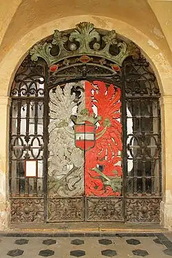 31. Bild: Das Bild an der Tür zur Jesuitenresidenz mit dem Gymnasium zeigt die Verehrung der Universitäten von Prag, Breslau und Olmütz. An den Seiten des Durchgangs befinden sich Statuen des hl. Johannes von Nepomuk und des hl. Judas Thaddäus.