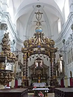 Die meisten Bildhauerarbeiten in der Kirche wurden von Franz Tollinger ausgeführt. Die barocke Kanzel aus dem Jahr 1714 stammt vermutlich von Franz Tollinger und ist reich verziert mit ornamentalen Schnitzereien und figürlichem Schmuck. Auf dem Schalldeckel der Kanzel befinden sich die alttestamentlichen Gestalten Moses, David, Daniel und Jesaja, darüber eine umfangreiche Figurengruppe zur Bekehrung des Saulus zum Paulus vor Damaskus. Über den Eingängen zu den Sakristeien befinden sich die Bilder zweier Jesuiten, die 1853 heilig gesprochen wurden. Das Bild gegenüber der Kanzel stellt den hl. Aloisius von Gonzaga dar. Die barocken Kirchenbänke mit ornamental geschnitzten Seitenteilen stammen aus der Zeit um 1730.