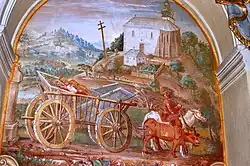 Das kreisrunde Kuppelbild mit zwei gegenüberliegende Bildern von Wenzel Schmidt zeigt unterschiedliche Fuhrwerke. Der Sage nach schafften es sechs starke Pferde nicht, eine Mutter-Gottes-Statue den Berg zur Kirche hinauf zu ziehen. Erst als man ein Gespann aus einem Pferd und einem Ochsen vor den Karren spannte, gelang der Transport.