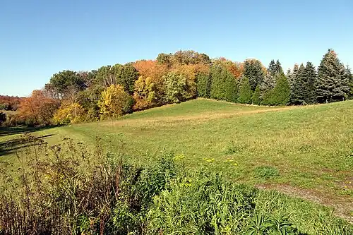 Die Hügelkuppe ist dicht mit Gehölzen bewachsen, darunter fallen viele Vogel-Kirschen auf. Im Nordosten stehen auch einige standortfremde Fichten. In der Krautschicht gedeihen große Bestände Kleines Springkraut.[5] Im Bereich der höchsten Kuppe hat sich Einjähriges Silberblatt stark ausgebreitet.